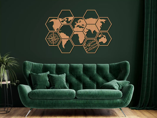 Harta Lumii Hexagonală - Decorațiune Perete Fibre Lemn
