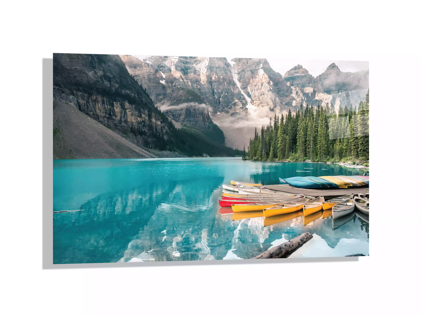 "Paleta Naturii" este o celebrare vibrantă a culorilor și frumuseții naturale, capturată într-un tablou care transformă orice spațiu cu energia sa pozitivă. Această imagine încântătoare prezintă un lac turcoaz înconjurat de munți impunători, cu bărci aliniate pe mal ca un spectacol de culori gata de aventură. Reflexia limpede a cerului și a muntelui în apa cristalină adaugă o dimensiune de liniște și adâncime, invitând privitorul să exploreze frumusețile neatinse ale naturii.